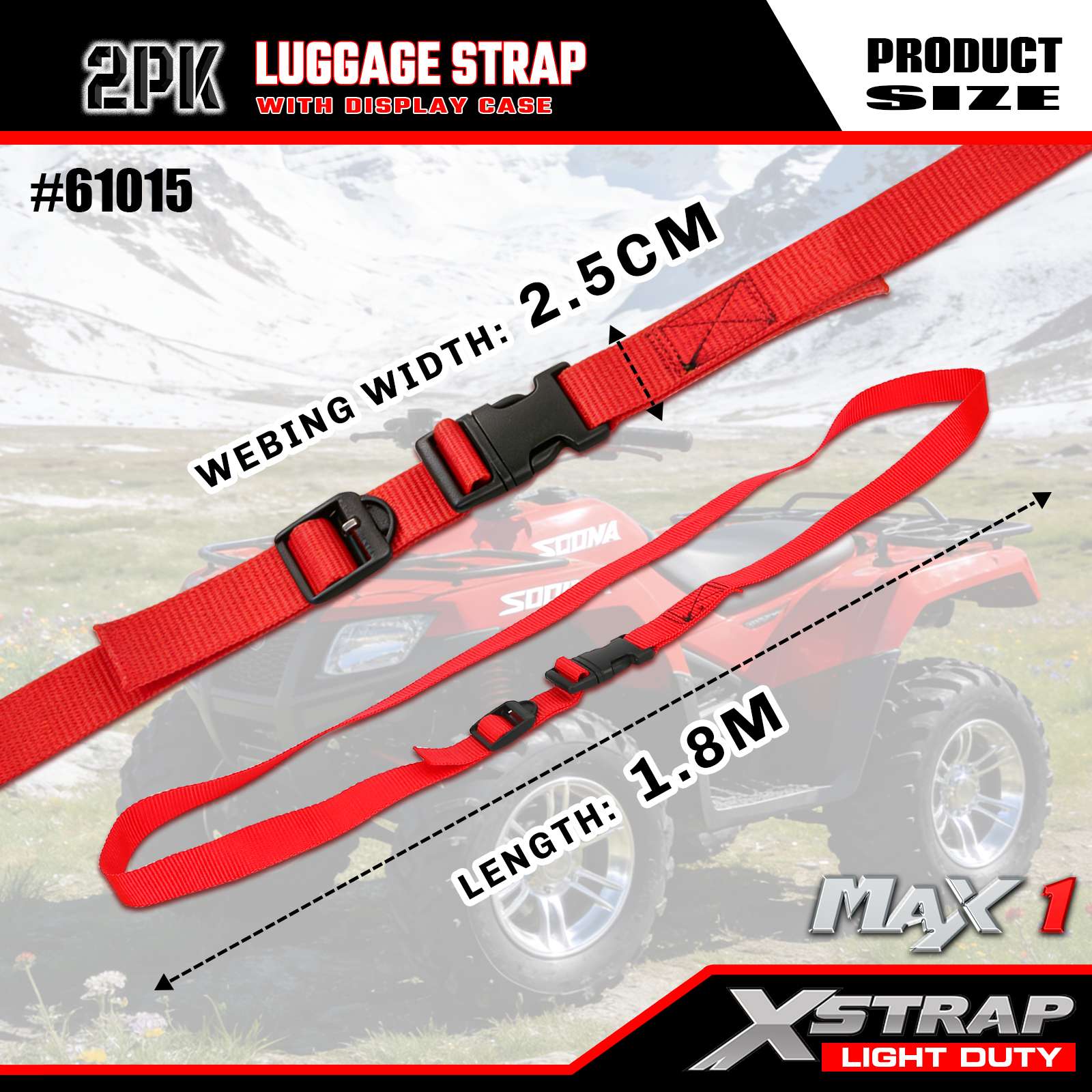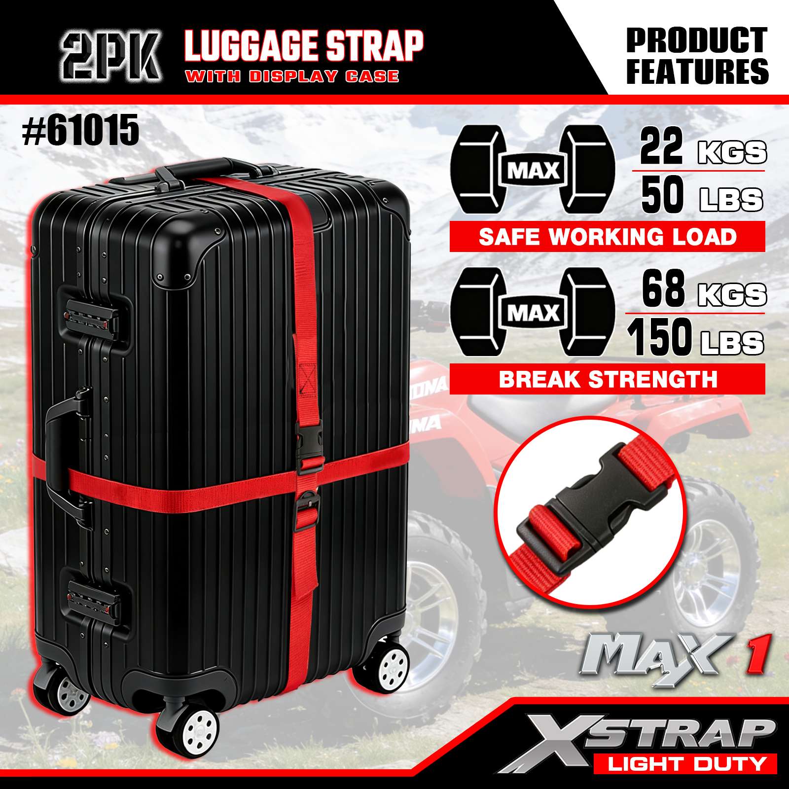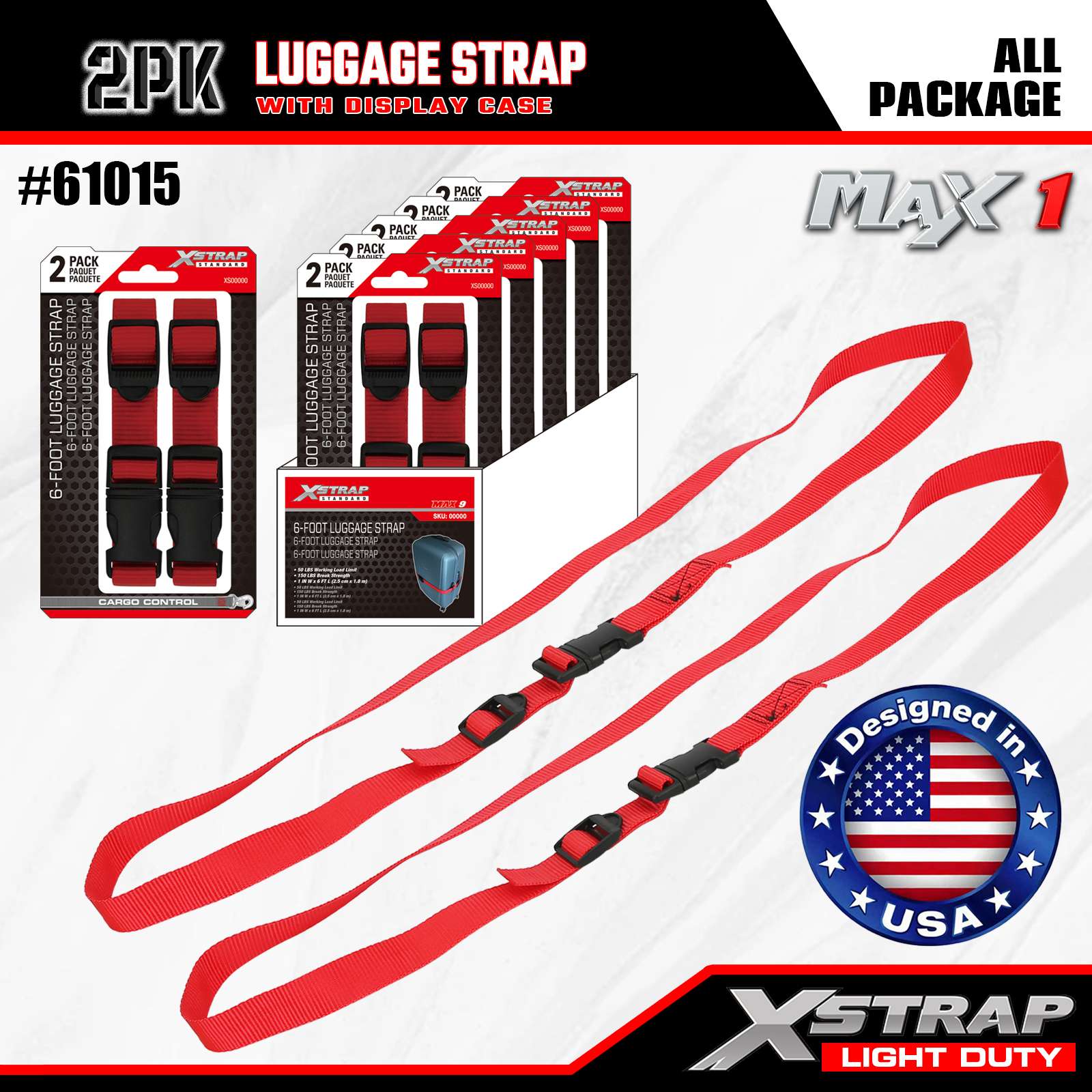 สายรัดกระเป๋าเดินทางแบบปรับได้ Xstrap 2 แพ็ค, 1” x 6’ - ฝารับน้ำหนัก 50 ปอนด์- ความแข็งแรงในการแตกหัก 150 ปอนด์-สายรัดสินค้าสำหรับกระเป๋าเดินทาง, ง่ายต่อการระบุขั้วต่อเข็มขัดเดินทางยึดกระเป๋าเดินทางไว้ด้วยกัน, ยืดอายุของกระเป๋า, สายรัดเชื่อมต่อกับกระเป๋าสองใบ, สีแดง