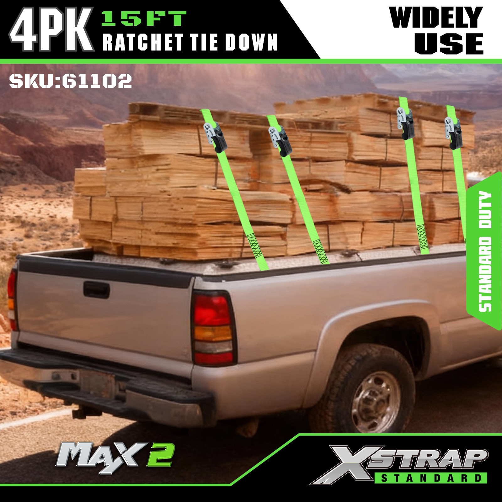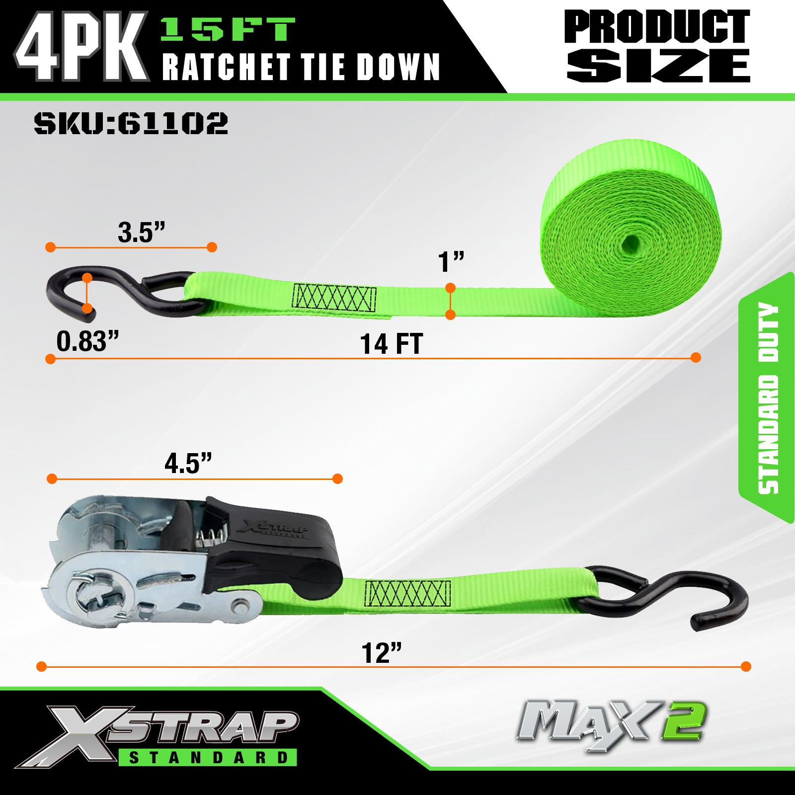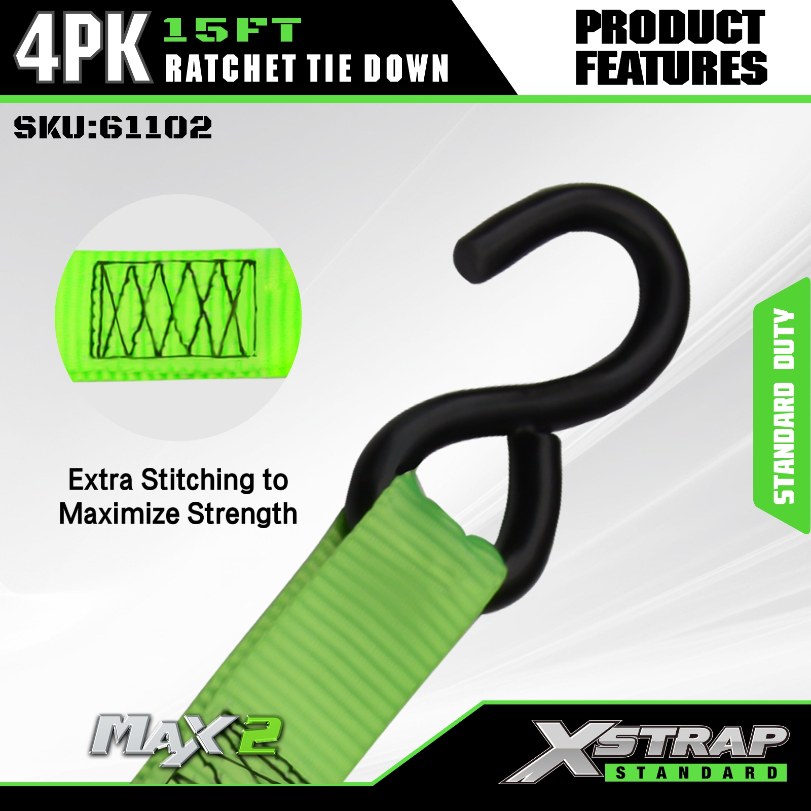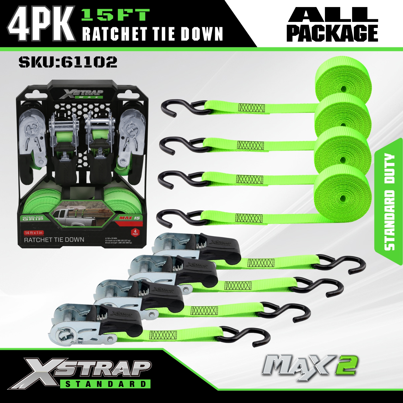 Xstrap Ratchet Tie Down Straps 4 PK 15Ft- 500 Lbs ความจุในการโหลด 1,500 Lbs Break Strength-สายรัดสินค้าสำหรับเคลื่อนย้ายเครื่องใช้ไฟฟ้า อุปกรณ์สนามหญ้า รถจักรยานยนต์