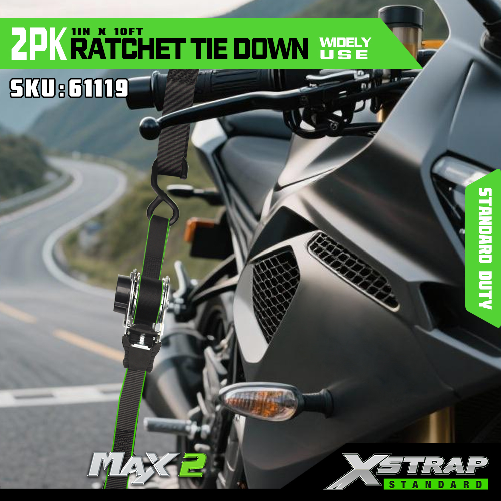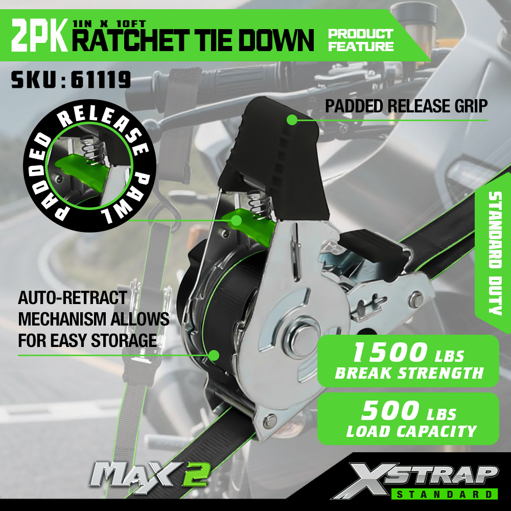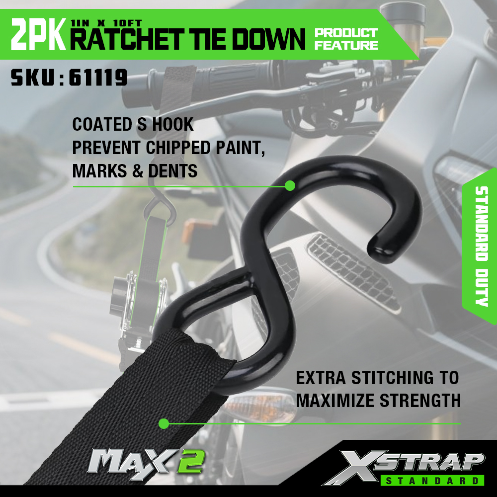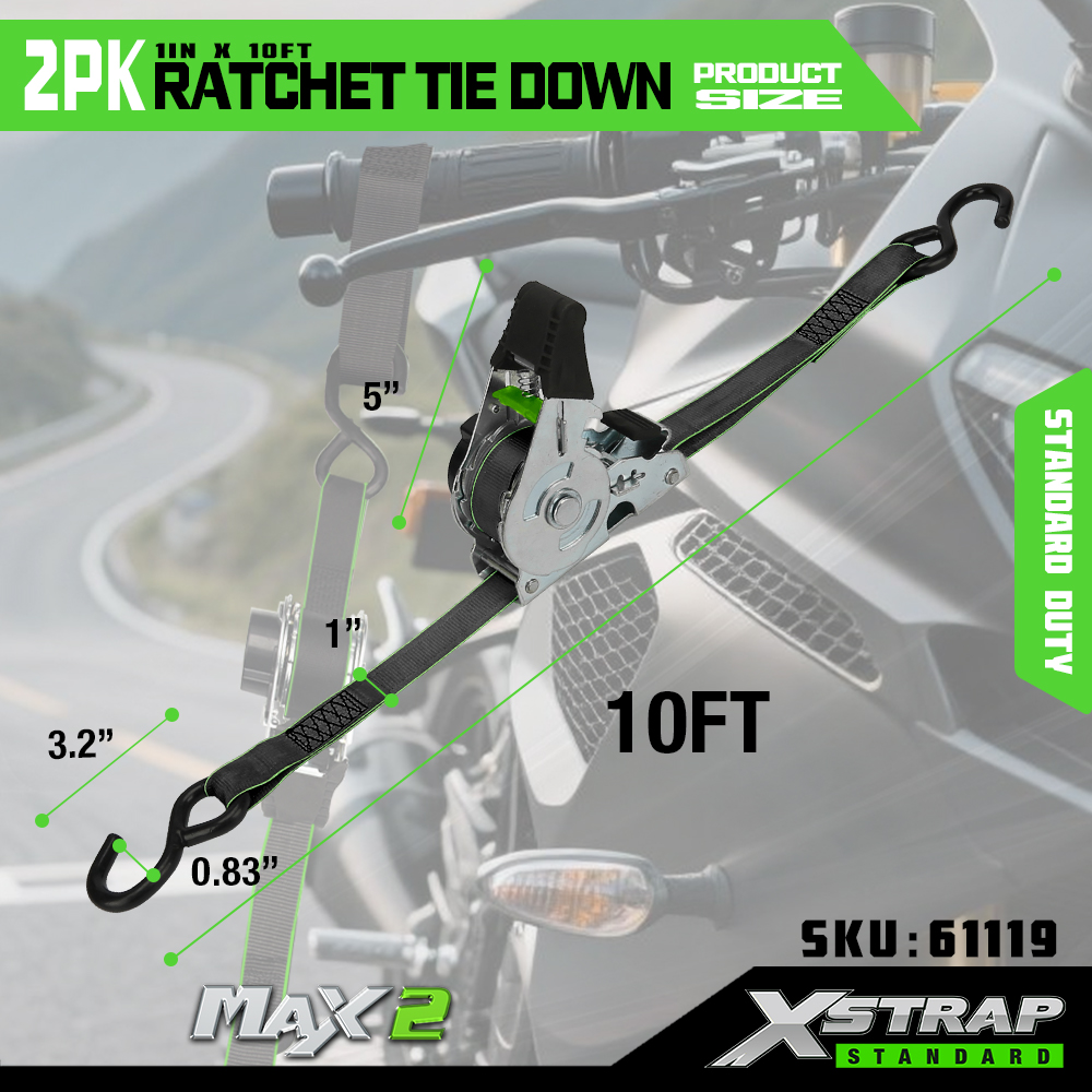 Xstrap 2 Pack Ratchet Tie Down, 1” x 10’ สายรัดโพลีเอสเตอร์แบบดึงสายรัดวงล้อ, สายรัดยึดสายรัดสินค้าความจุ 500 ปอนด์พร้อมตะขอรูปตัว S สำหรับรถกระบะ, รถ SUV, ชั้นวางของบนรถยนต์ รถจักรยานยนต์, เรือตกปลาขนาดเล็ก, เจ็ตสกี, รถเคลื่อนบนหิมะ, รถแทรกเตอร์สนามหญ้า